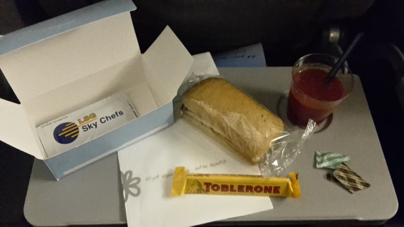Das deutsche Flugpersonal war freundlich und hilfsbereit. Nach dem pünktlichen Start begann so langsam der Service. Insgesamt kam das Flugpersonal 4 mal mit dem Getränkewagen durch in dem alle Softdrinks, Säfte, Kaffee und Wasser kostenlos waren. Man konnte auch ohne Probleme 2 Getränke auf einmal fordern oder natürlich über die Service Taste über einem auch nochmal etwas zu trinken anfordern. Als Snack gab es eine kleine Box mit einem Käse-Ciabatta (Ciabatta mit Käse, Getrockneter Tomate und Salatcreme-> wirklich sehr schmackhaft obwohl es nicht doll aussah), einer Toblerone und einem Erfrischungstuch. (siehe Foto)